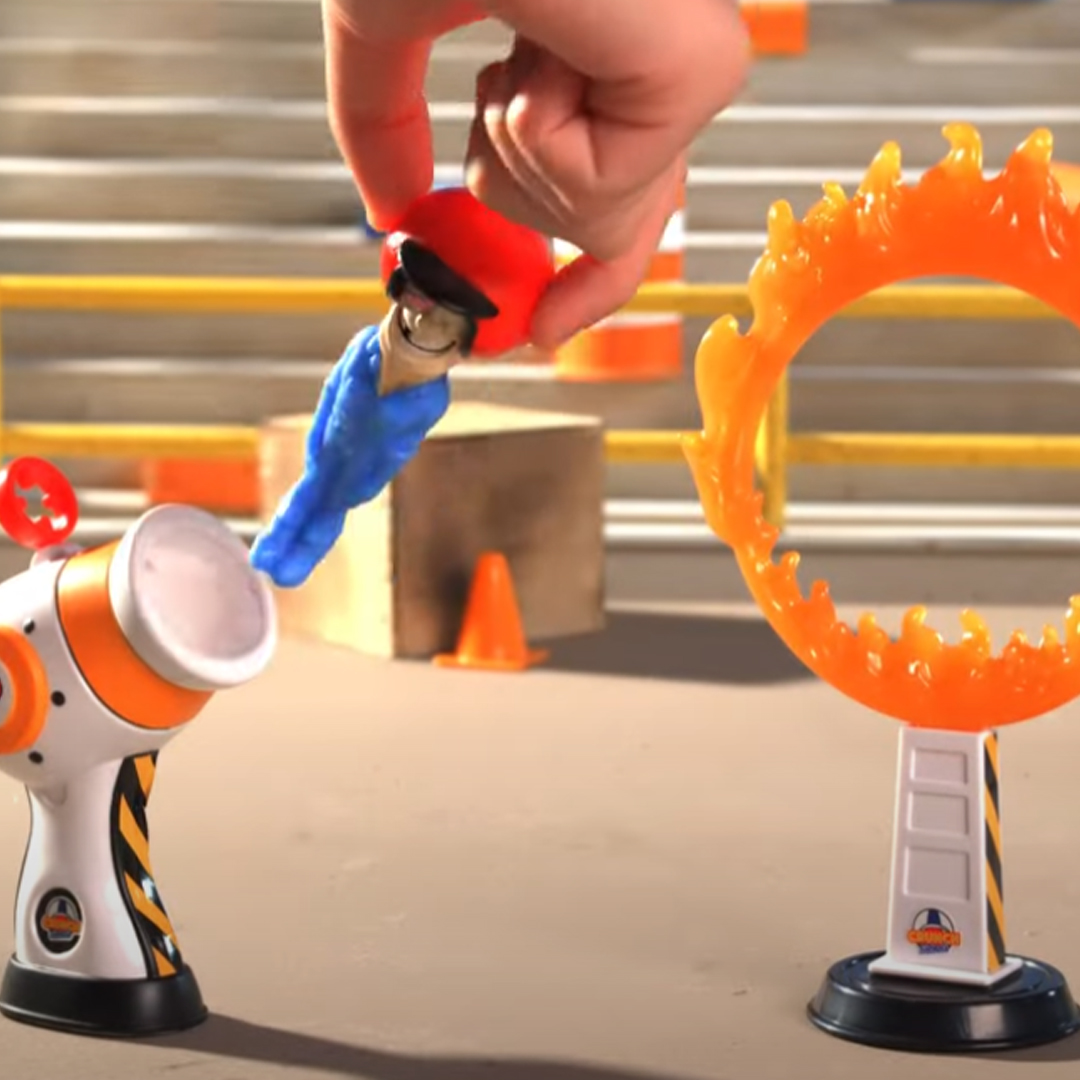 SLING SHOT ACTION Get ready for stretchy sling shot action with the Stuntman Stu Hot Shot Cannon Blast. Feel the heat of the ring as Stu goes head-to-head with the fiercely flaming Ring of Death! Will he be ‘Frying or Flying’ when you aim, shoot and fire!
